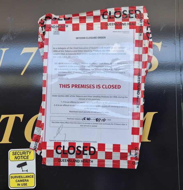 Police and Central Queensland Public Health Unit officers have raided illegal smoke shops across Gladstone, Rockhampton, Yeppoon, Gracemere, Blackwater and Emerald, shutting them down for 72-hour periods before taking court action against their Victorian-based owner. (Supplied)