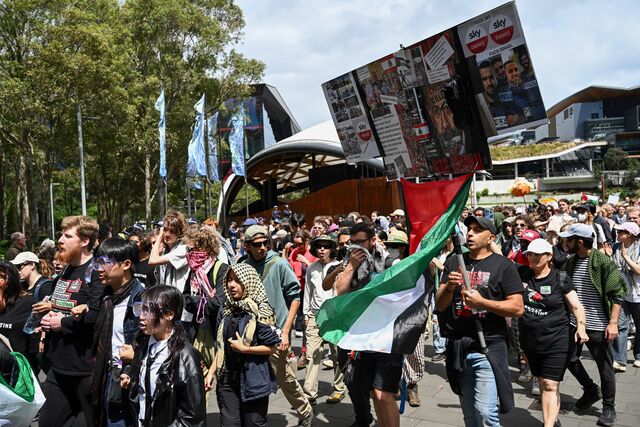 Protesters are moved on following an attempted blockade by the Palestine Action Group of the Indo-Pacific Weapons expo at the ICC Sydney, in Sydney, in 4 November. (AAP Image/Bianca De Marchi)