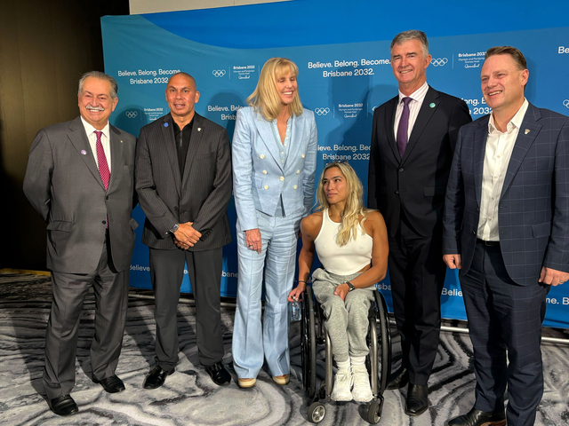 Patrick Johnson, Andrew Liveris, Cindy Hook, Adrian Schrinner, Tim Mander, Madison De Rozario promoting the 2032 Olympics and Paralympics in Brisbane. (Andrew Stafford/AAP)